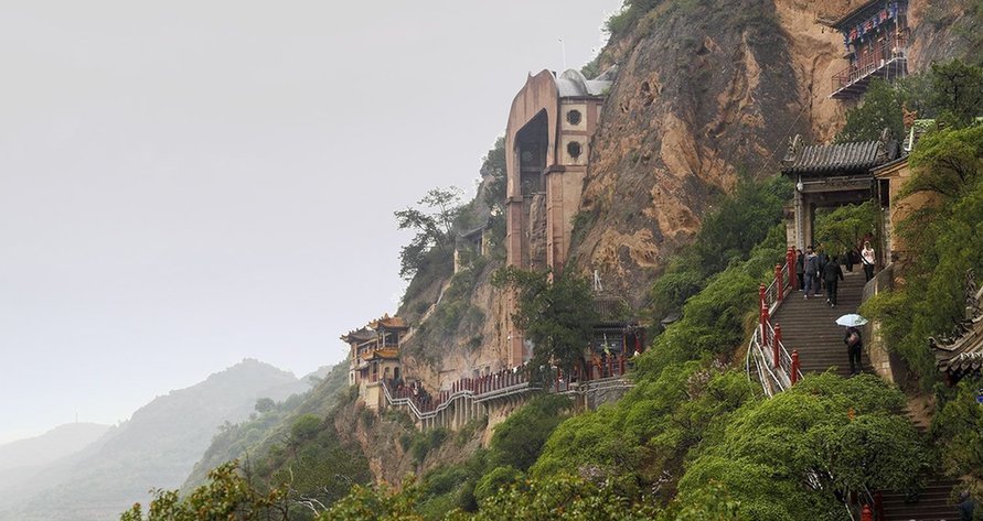 山上松桧丛生,丁香溢彩,亭台楼阁依山而建,雕栋画廊绿树掩映。山中悬崖间,峭壁上有大洞窟一个,洞内坐石胎泥塑大佛一尊。大佛高23.3米,肩宽9.5米,造像躯体浑厚雄伟,法象庄严,气势宏大,具有很高的历史、艺术及科学研究价值。佛像开凿于高34米、宽14米、深4.5米的平面作长方形的圆拱形大窟内,顶部周围悬塑有达摩、频伽、飞天、卷云、莲叶等,栩栩如生。
