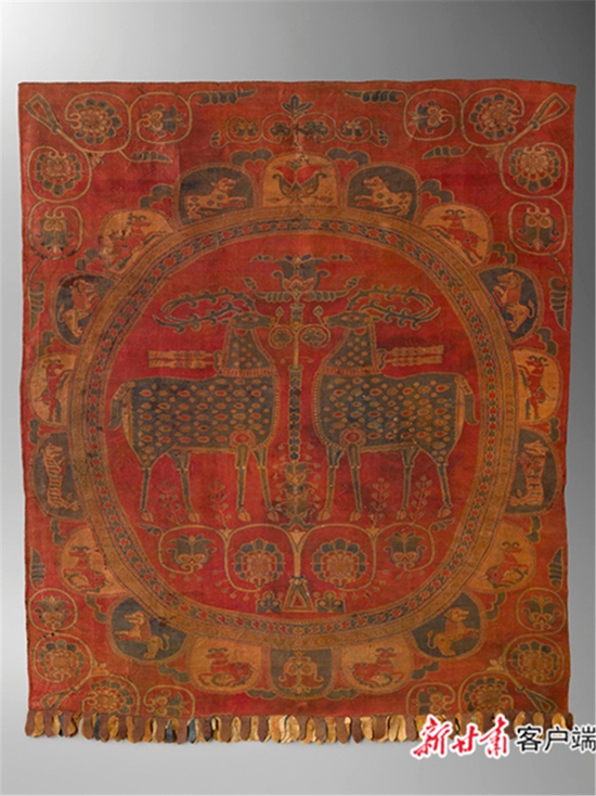 展览中最吸引人的文物,莫过于两大幅中亚团窠对鹿纹挂锦,堪称世所罕见,代表了7世纪中期至8世纪丝绸之路沿线织造工艺的最高水平。据介绍,这种大幅挂锦主要用于装饰吐蕃贵族的营帐。