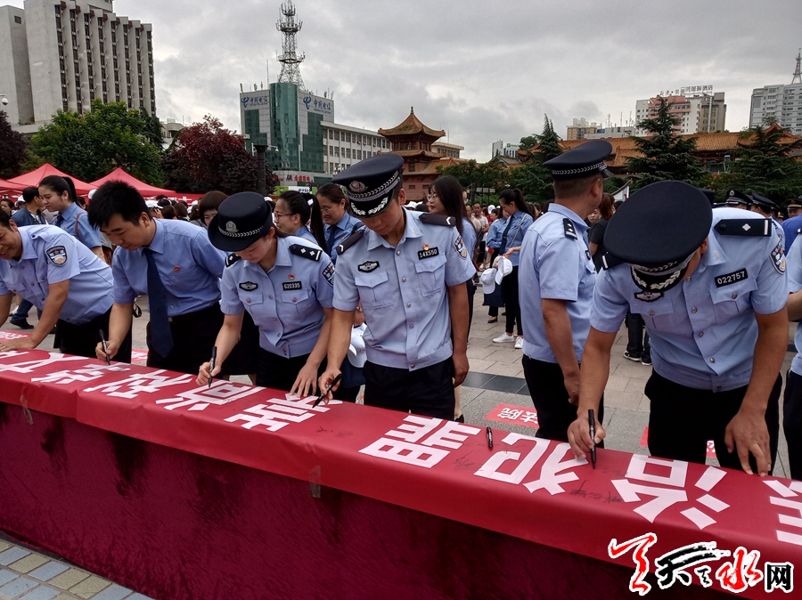 来自秦州区东关街道等单位的干警、干部职工以及群众代表纷纷在反邪教宣传横幅上签名。