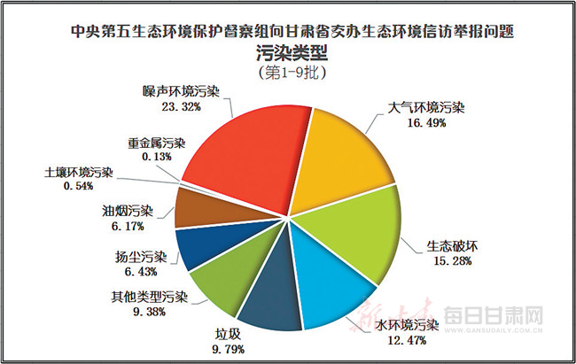 经统计,前九批次转办的545件生态环境信访举报问题中,噪声环境污染类问题占比23.32%,大气环境污染类问题占比16.49%,生态破坏类问题占比15.28%,水环境污染类问题占比12.47%,垃圾类问题占比9.79%,扬尘污染类问题占比6.43%,油烟污染类问题占比6.17%,土壤环境污染类问题占比0.54%,重金属污染类问题占比0.13%,其他类型占比9.38%。