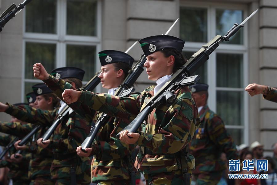 7月21日,在比利时布鲁塞尔,女兵参加比利时国庆阅兵式。 当日,比利时举行阅兵式庆祝国庆日。 新华社记者 郑焕松 摄