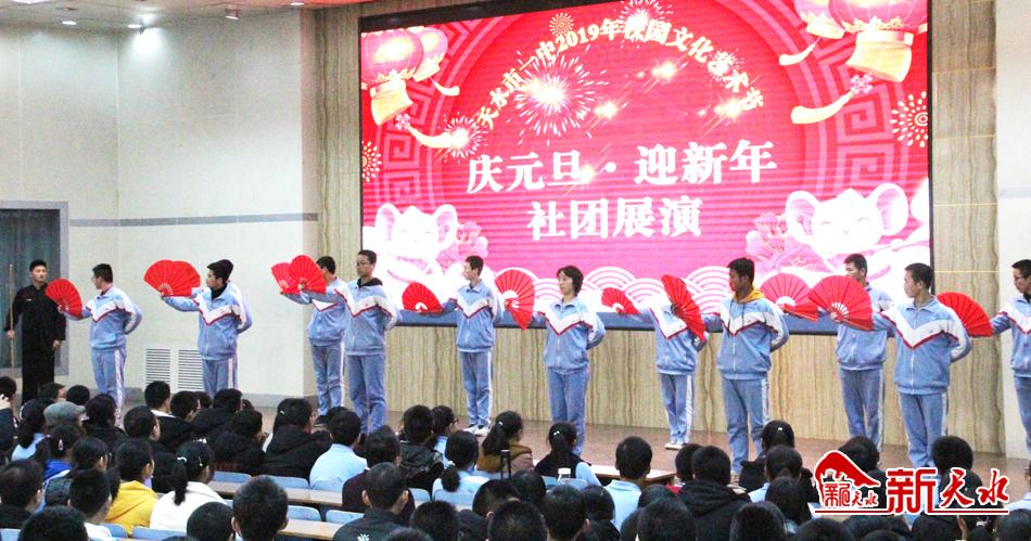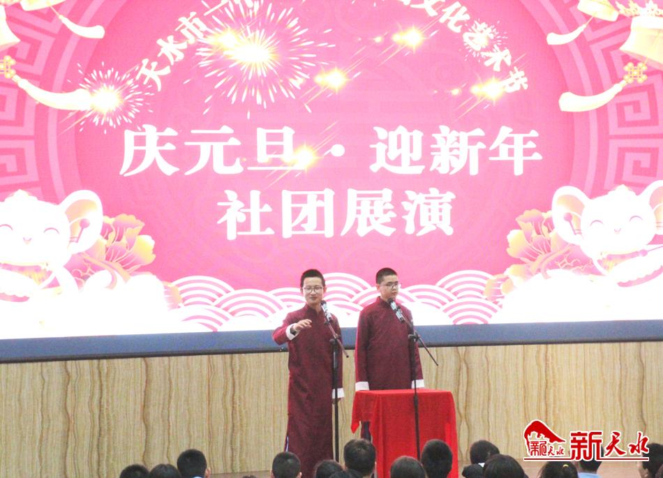 12月27日,天水市一中礼堂笑声阵阵,2019年校园文化艺术节“庆元旦·迎新年”社团展演正在热烈进行。活动在    《我和我的祖国》的歌声中拉开了序幕。各个学生社团还创作的武术、相声、舞蹈等多种才艺展示,表达对新年的祝福和向往。