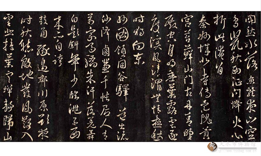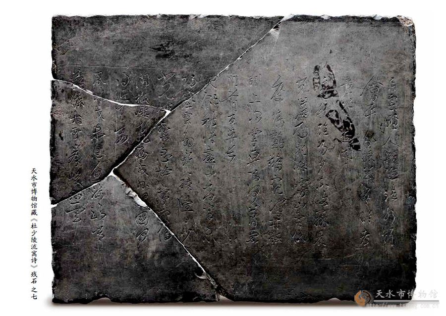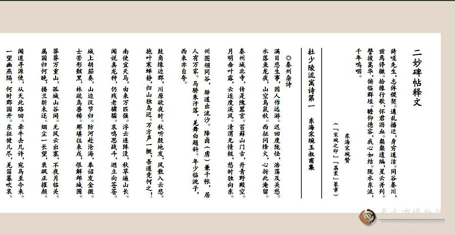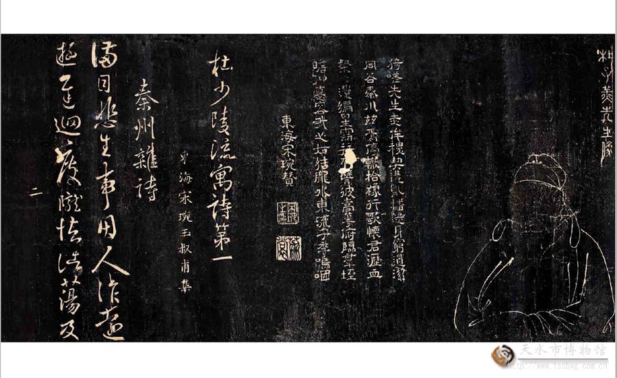 天水市城建档案馆藏的“二妙轩碑帖”拓片手卷是目前保存完整、品相最好、学术价值较高的秦州杜诗拓本。原二妙轩碑立于秦州玉泉观李杜祠堂(今已圮)。碑体长1516厘米,高24厘米,由34块刻石组成,是清顺治十三(公元1656)年,时任分巡陇右兵备道、清初著名诗人、山东莱阳人宋琬为纪念诗圣杜甫,选取了60首杜甫秦州诗,请“长于钩摹之技”的兰州张正言、张正心兄弟,以肃王府淳化阁帖本中王羲之、王献之作品(有少量魏晋时期书法家作品)为基础,集字钩摹上石,由陕西长安人卜栋镌刻而成,名为《杜少陵流寓诗》刻石,又称为“秦州杜诗”刻石。因诗妙字妙,故以“二妙”命名,碑称“二妙轩碑”。