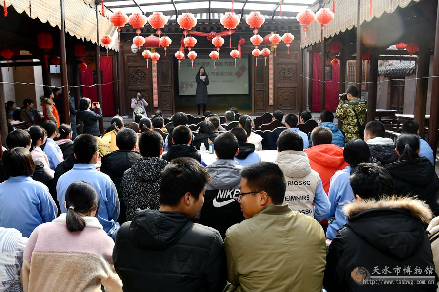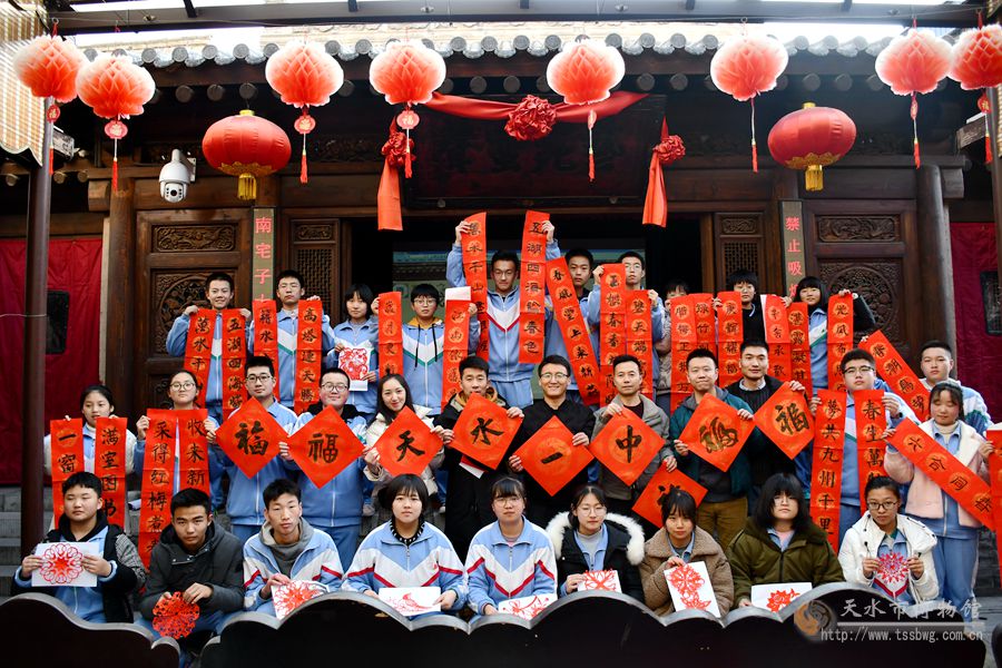 新天水讯 据天水市博物馆消息 2020年1月13日,由天水民俗博物馆、天水书法院、天水市一中联合举办的“我的中国梦 挥毫写吉祥”百人写春联民俗活动在天水民俗博物馆南宅子戏苑成功举办。来自天水书法院的书法家彭卫、刘晖、童强、王绪生、赵志强、颉军红、王卫红、李丹、杨建东、刘战平和天水市一中总校、分校的师生120余人参加了活动。