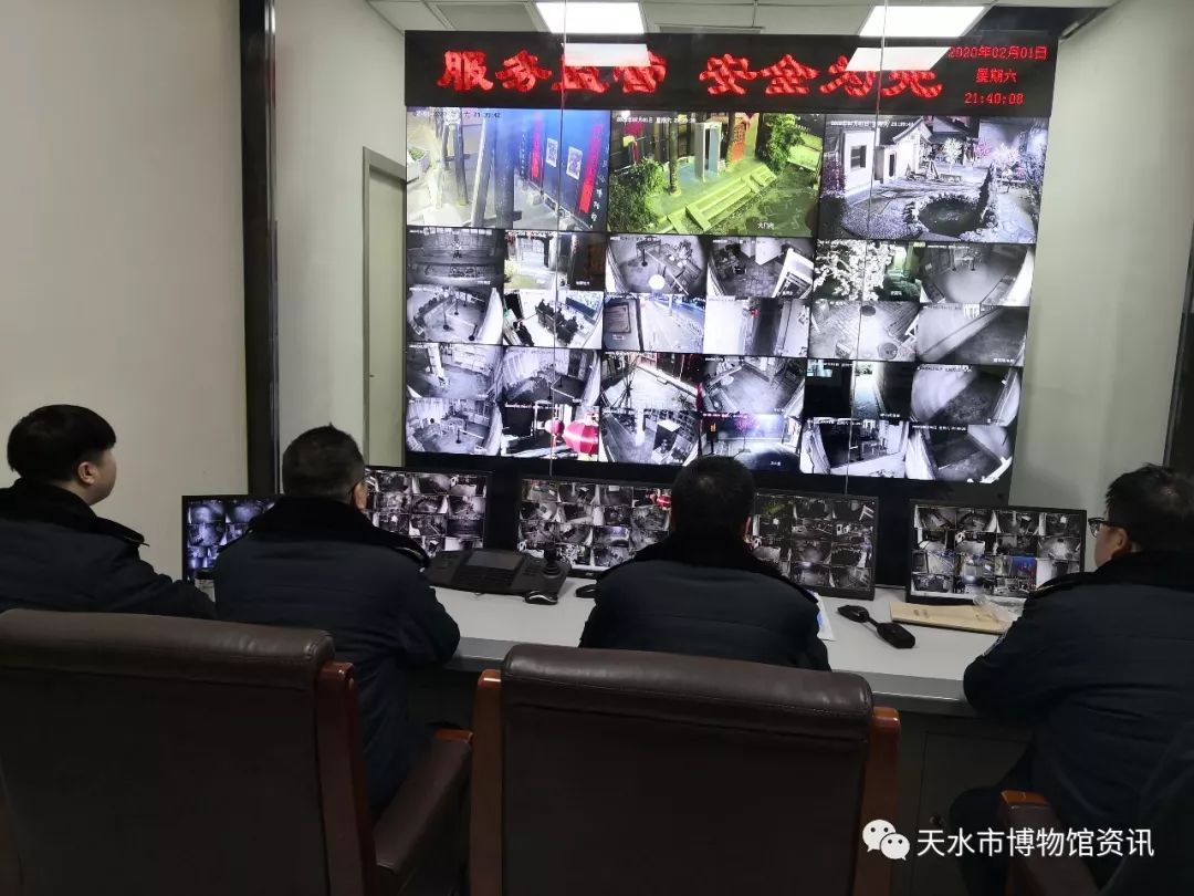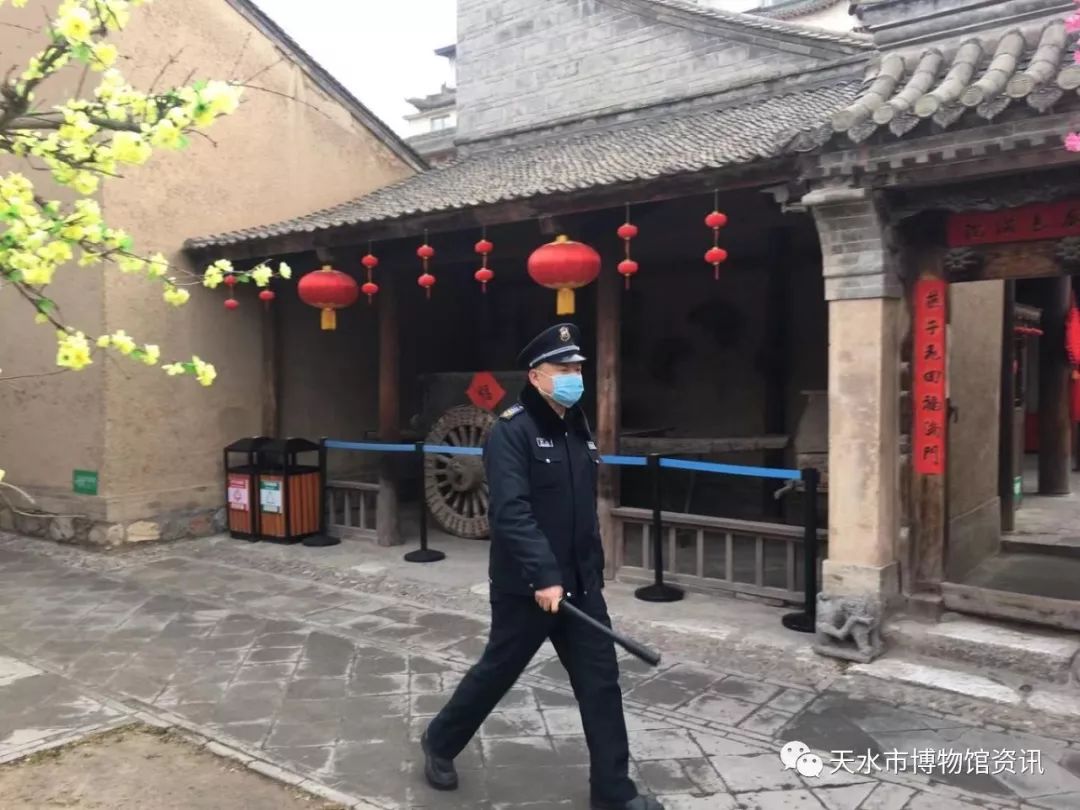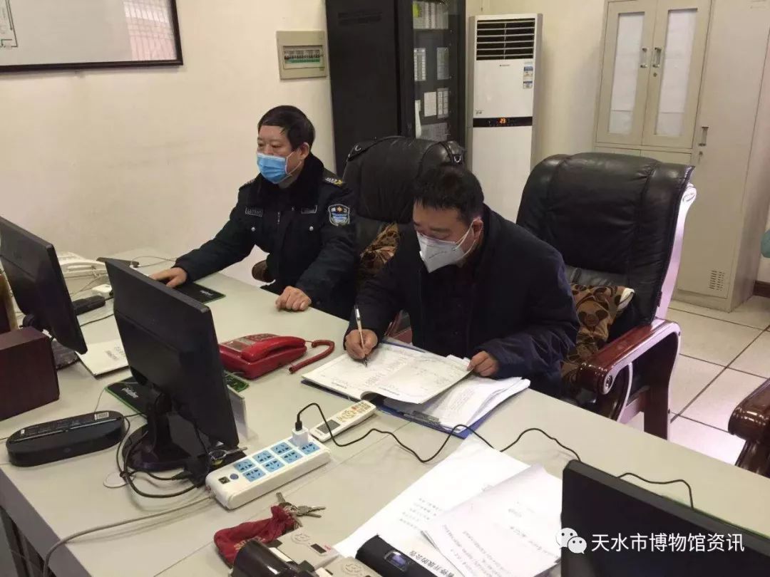 在全面抗击疫情期间,天水市博物馆严格落实市委市政府、市文化和旅游局关于新型冠状病毒感染的肺炎疫情防控部署精神,立足早动员、早防控、全方位防控的措施。针对春节期间一线防控任务重、范围广、难度大、风险高等实际,严格落实领导带班制度,天水市博物馆和天水民俗博物馆建立了24小时值班值守和巡查制度、交接班制度等一系列切实有效的措施,所有保卫岗位的人员,包括监控、巡查、门卫等人员在预防工作机制上做到了白天黑夜的“无缝对接”,真正做到了把疫情有效防控和文物安全有保障相结合。