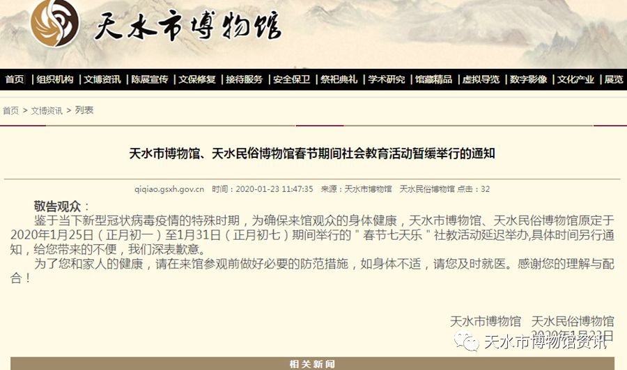 1月23日,在天水市博物馆发布《天水市博物馆、天水民俗博物馆春节期间社会教育活动暂缓举行的通知》,并停止举办各项文化活动。