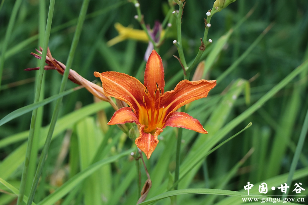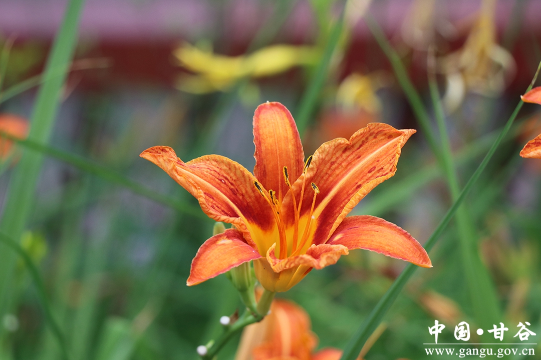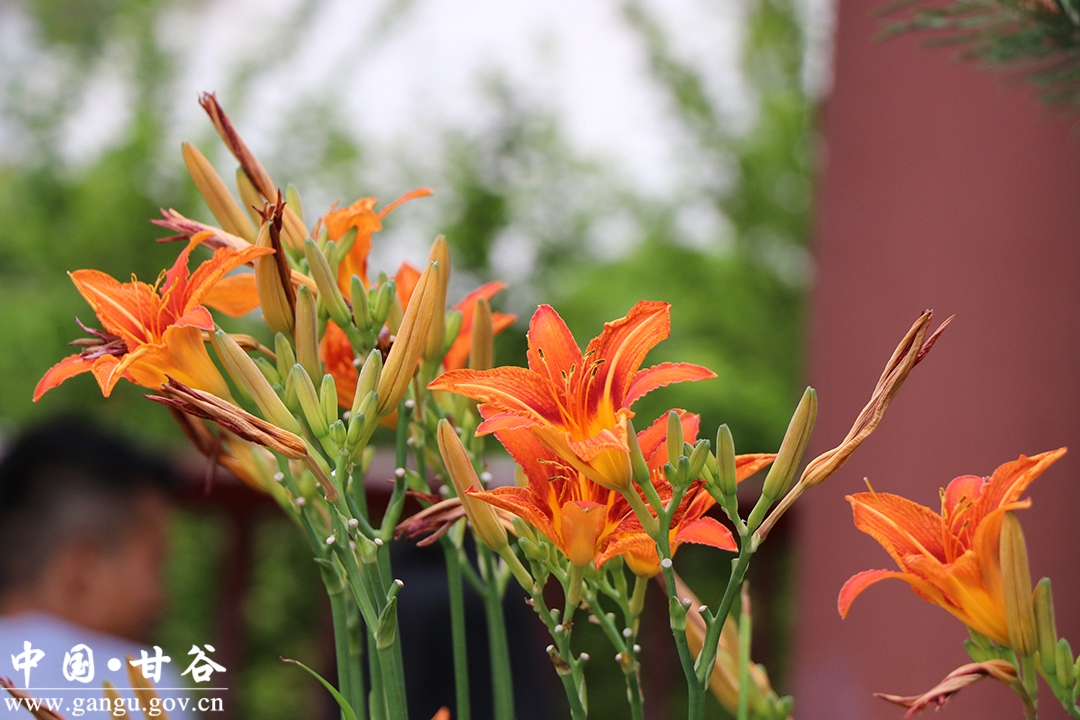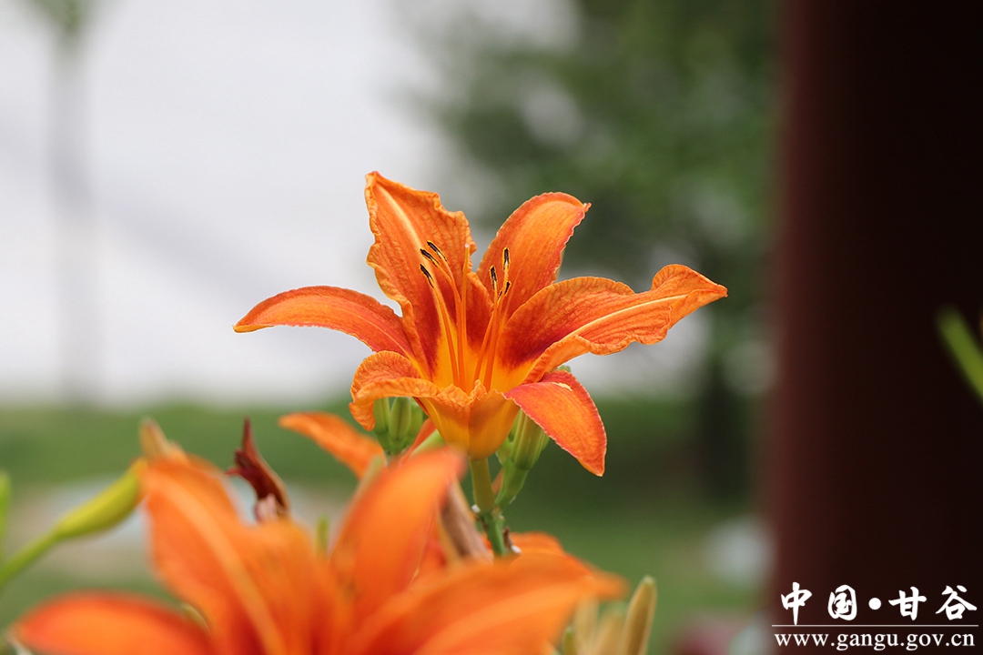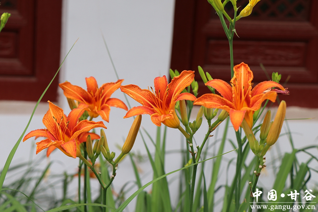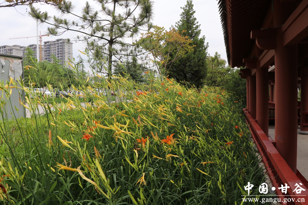 大像山公园崇文阁回廊外侧,萱草叶色青翠,随风摇曳,橙黄色的花朵盛放在夏季大片浓绿的园林背景之中,形成了鲜明的对比,活跃了园林氛围,带来朝气蓬勃之感。萱草花桔红色至淡红色,花被管较细长,长2-4厘米,花开绚烂,具有独特的镶边效果。