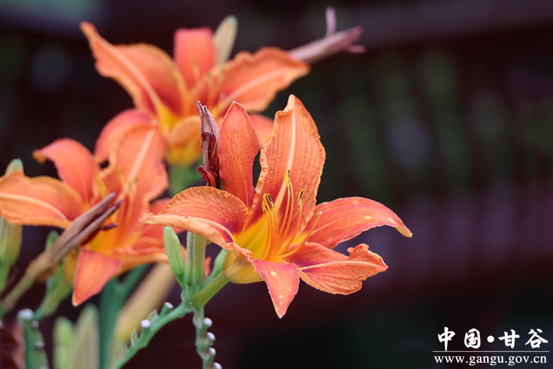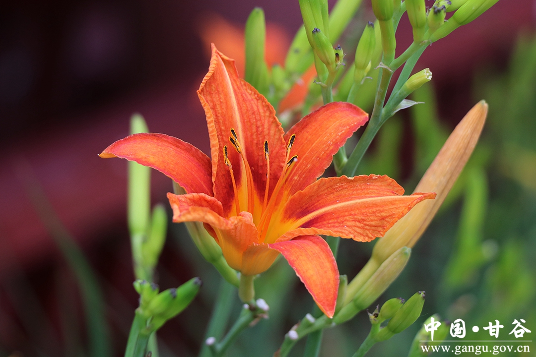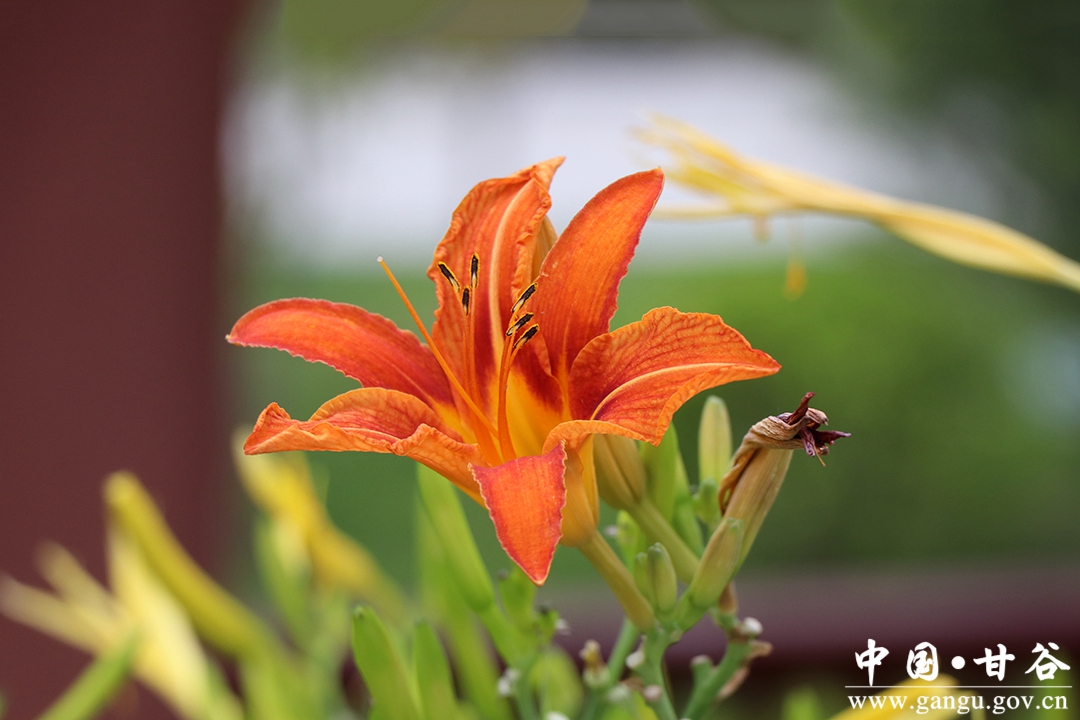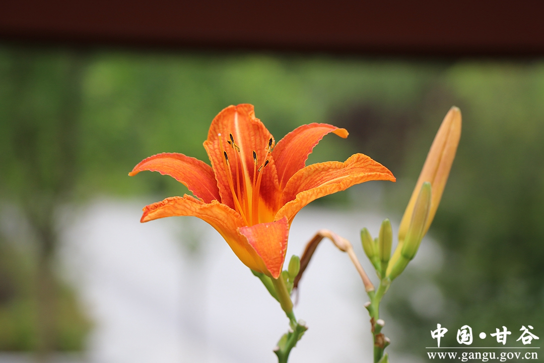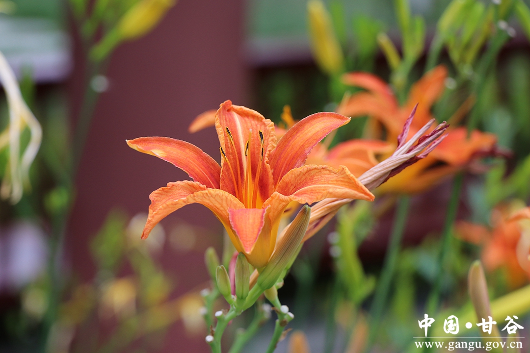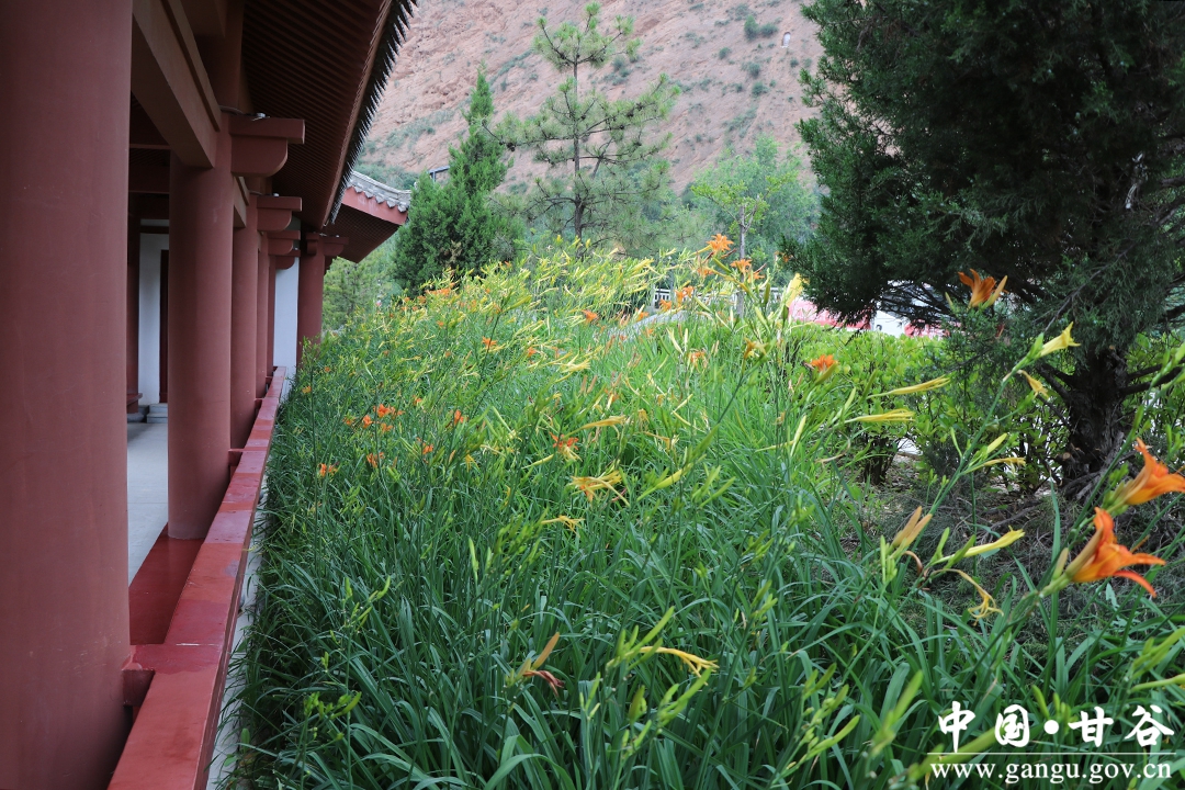 大像山公园崇文阁回廊外侧,萱草叶色青翠,随风摇曳,橙黄色的花朵盛放在夏季大片浓绿的园林背景之中,形成了鲜明的对比,活跃了园林氛围,带来朝气蓬勃之感。萱草花桔红色至淡红色,花被管较细长,长2-4厘米,花开绚烂,具有独特的镶边效果。