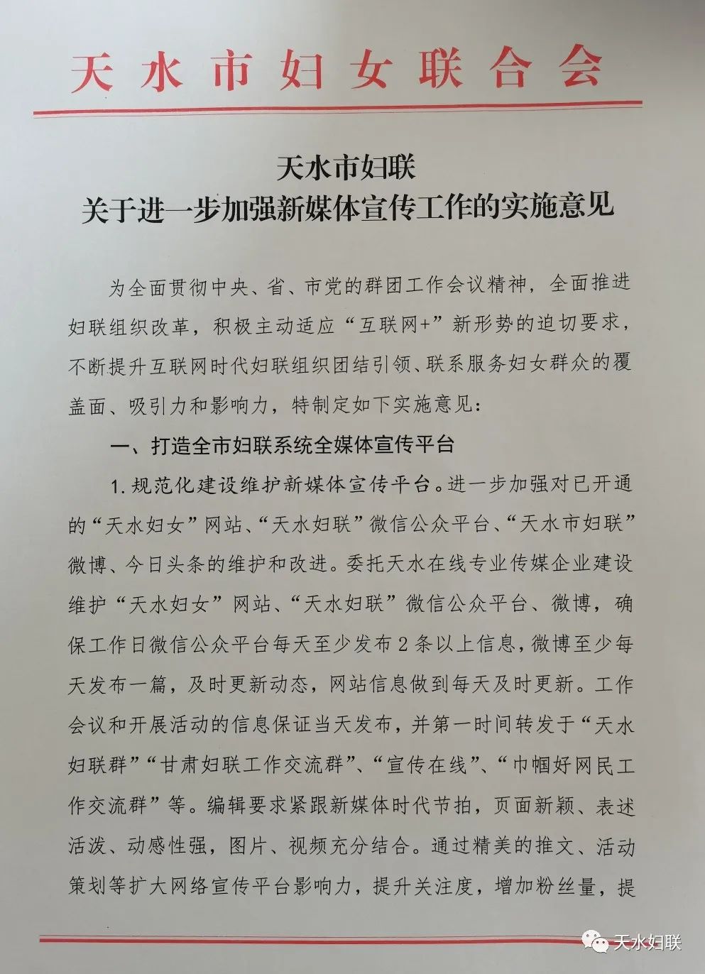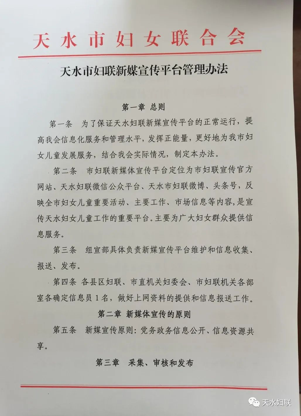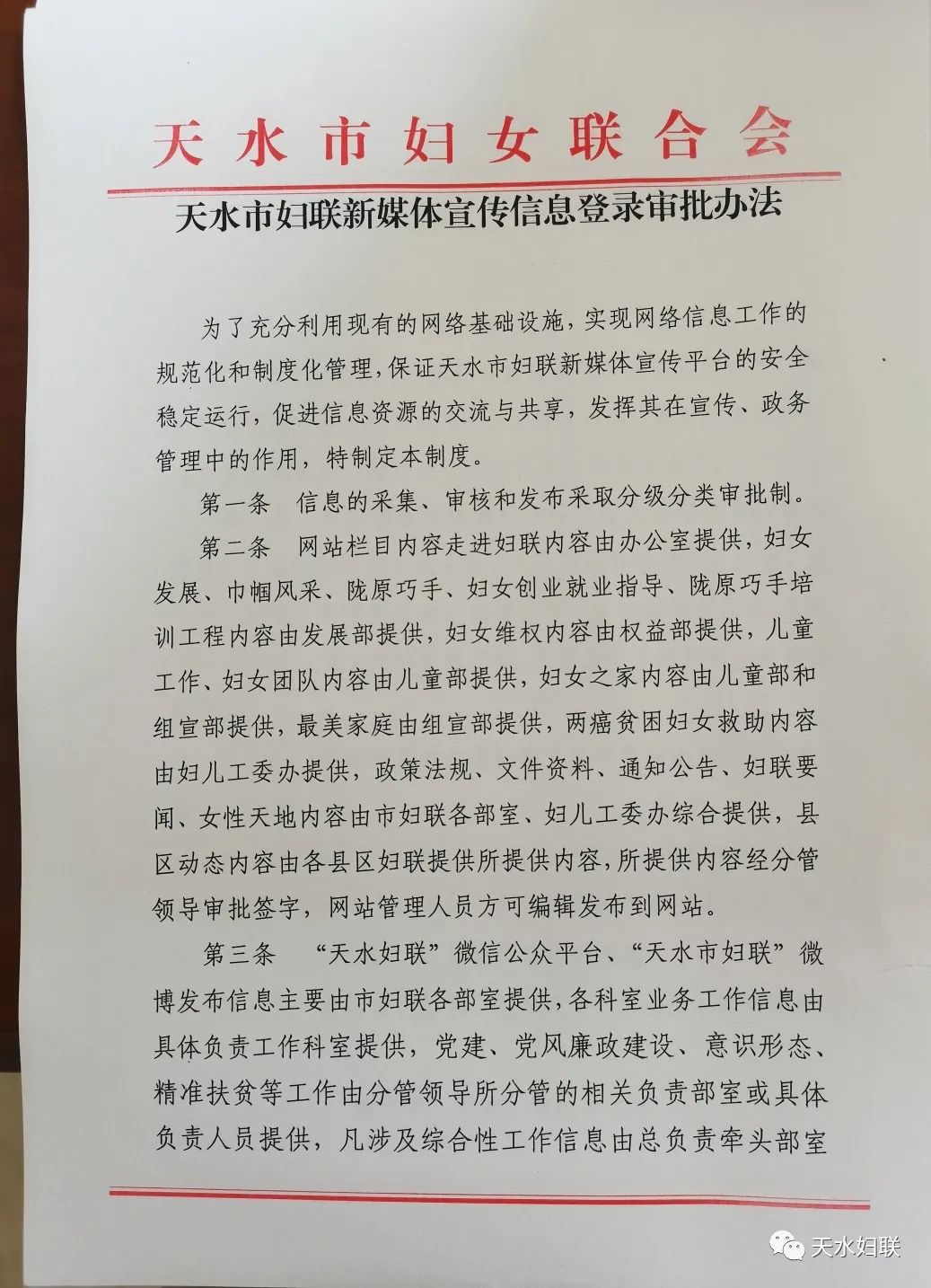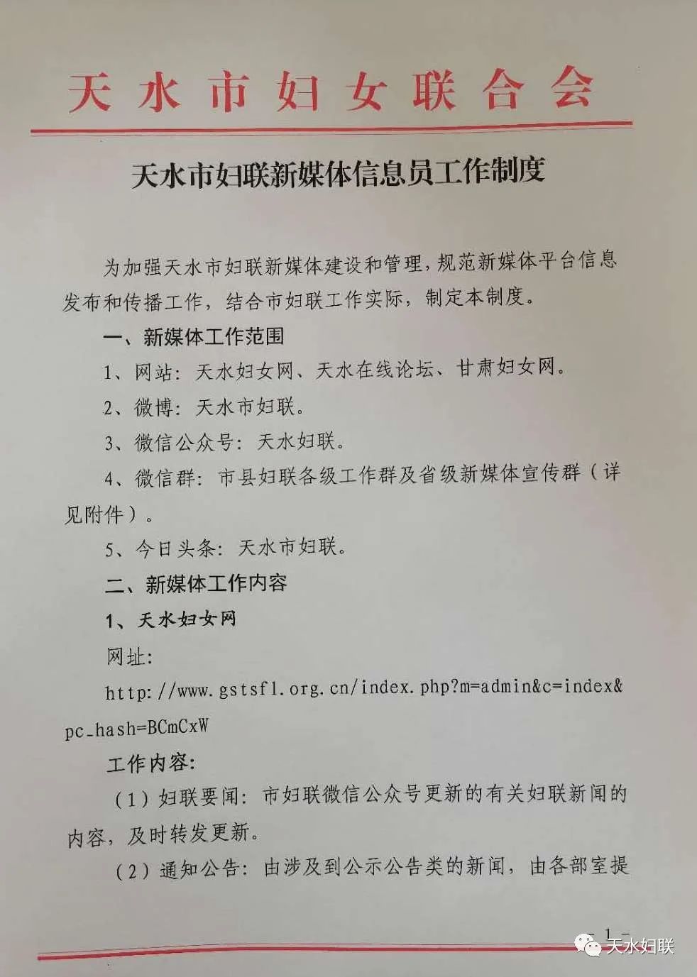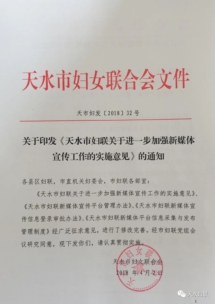 市妇联制定下发了《天水市妇联关于进一步加强新媒体宣传工作的实施意见》、《天水市妇联新媒体宣传平台管理办法》、《天水市妇联新媒体宣传信息登录审批办法》、《天水市妇联新媒体平台信息采集与发布管理制度》,规范化开展新媒体宣传。同时制定了《天水市妇联信息员工作制度》、《天水市妇联网站工作分工》,明确责任分工,分解工作任务,推广网络宣传。