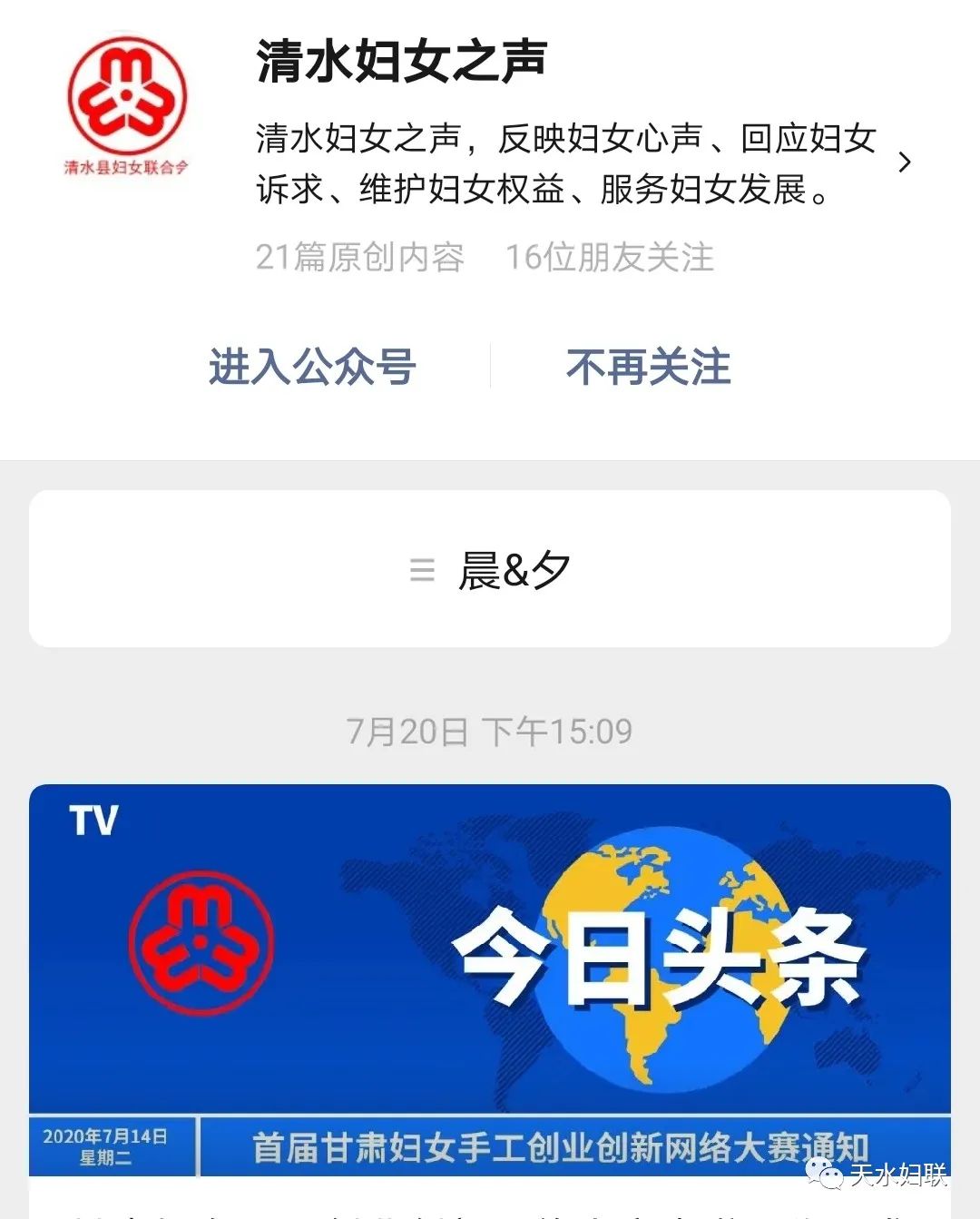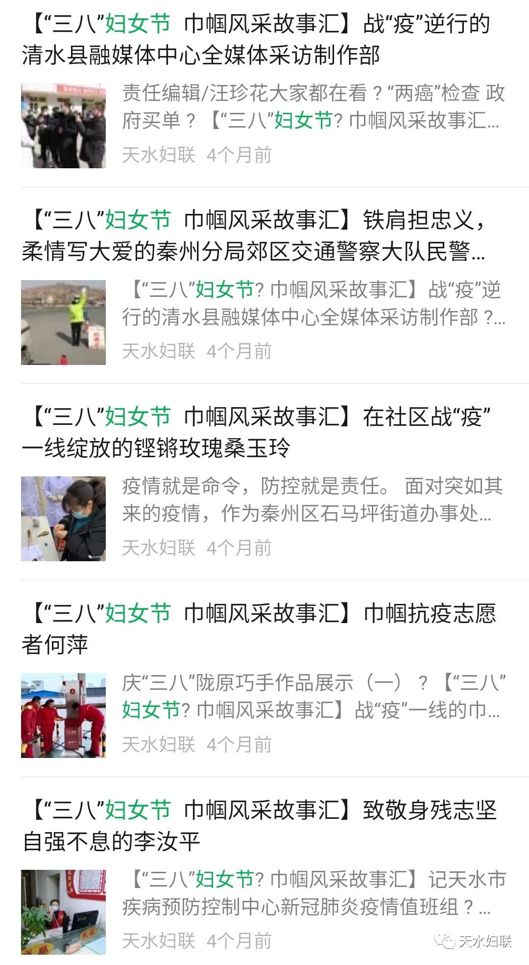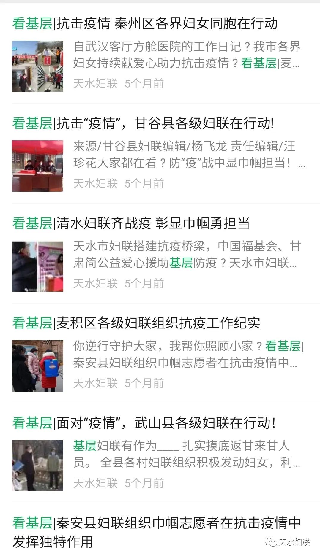 天水市妇联现已开通“天水妇女”网站、“天水妇联”微信公众平台、“天水市妇联”微博、头条号四个宣传平台。七个县区妇联各自开通微信公众平台。自新媒体平台建立以来,市妇联网站、微信公众号、头条号、微博发布信息5092多条、点击阅读量达297多万人次,特别是天水妇联公众号多次跻身全国地市级妇联微信公众号传播指数50强,市妇联网络新媒体平台真正起到了颂扬主旋律,传播正能量,引导妇女思想的作用。仅在新冠肺炎疫情防控中,全市妇联组织运用网络新媒体的微信微博平台矩阵、头条号、网站发布各类信息报道512条,累计阅读量达到52.2万人次,全国、省新闻媒体转载42次,天水巾帼扶贫车间里薪金股金一起拿”被中国妇女报头版、学习强国、中国妇联新闻、甘肃妇女、今日头条刊发,切实发挥了网络新媒体在引导、服务妇女中的作用。