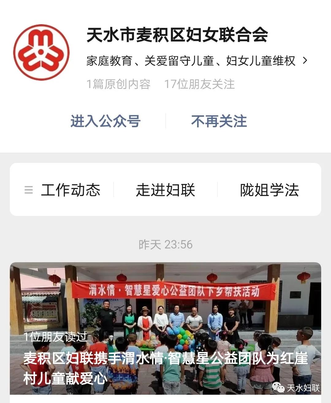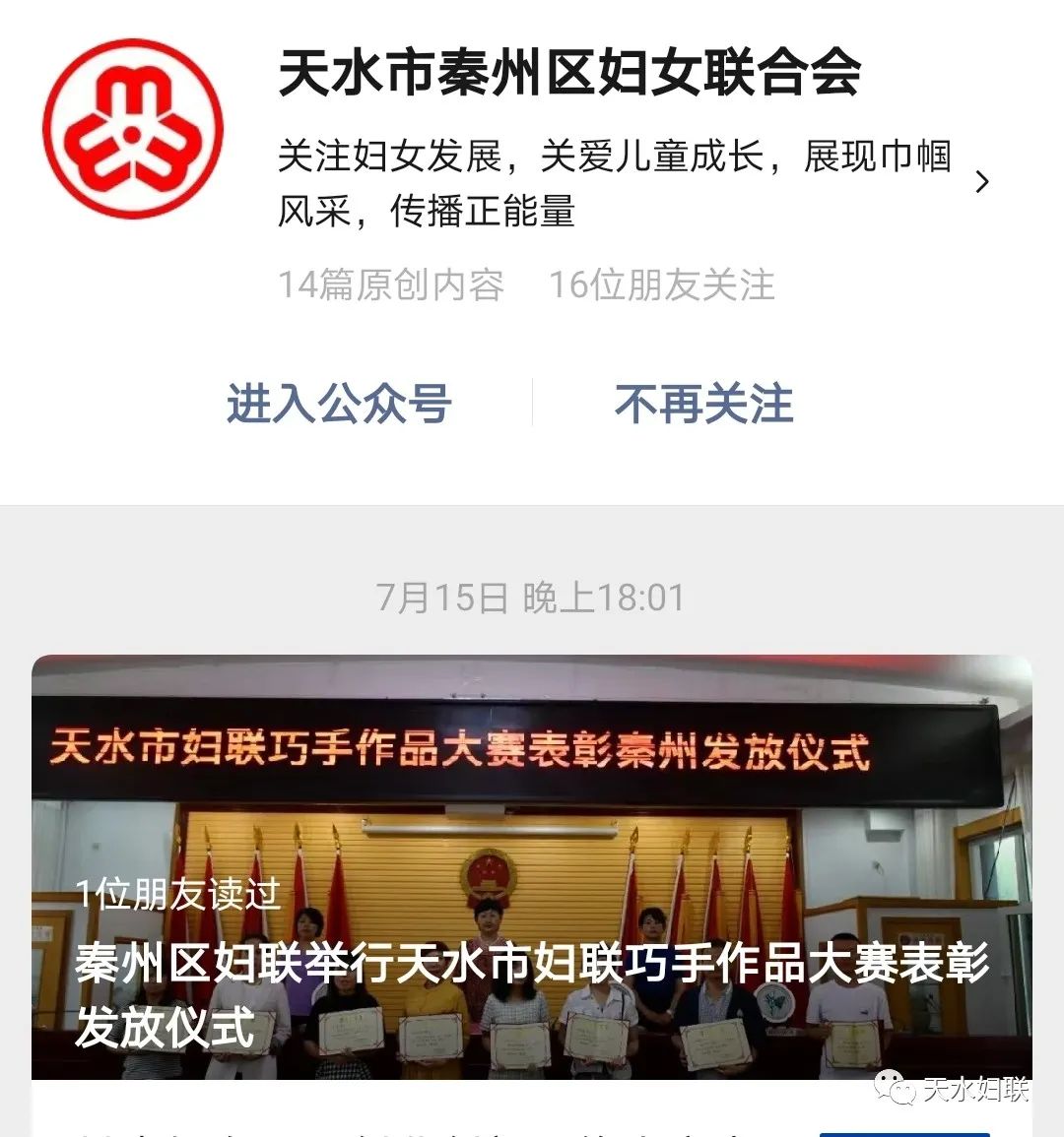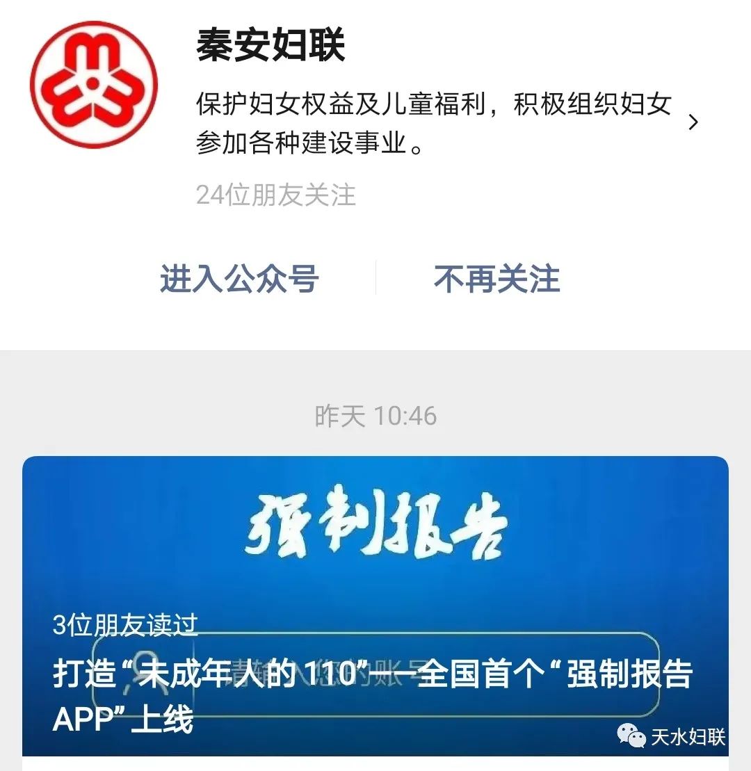 全市妇联组织共建成四级网上妇女之家微信群、QQ群2133个,实现全市网上妇女之家全覆盖,构建了以“天水妇联”微信公众号为轴心,各县区妇联微信公众号为支撑,市、县区直机关妇委会、各乡镇(街道)、村(社区)妇女微信群为触手的“网上妇女之家”新格局,通过上下的有效呼应,真正实现妇联组织“一呼百万”的组织影响力。
