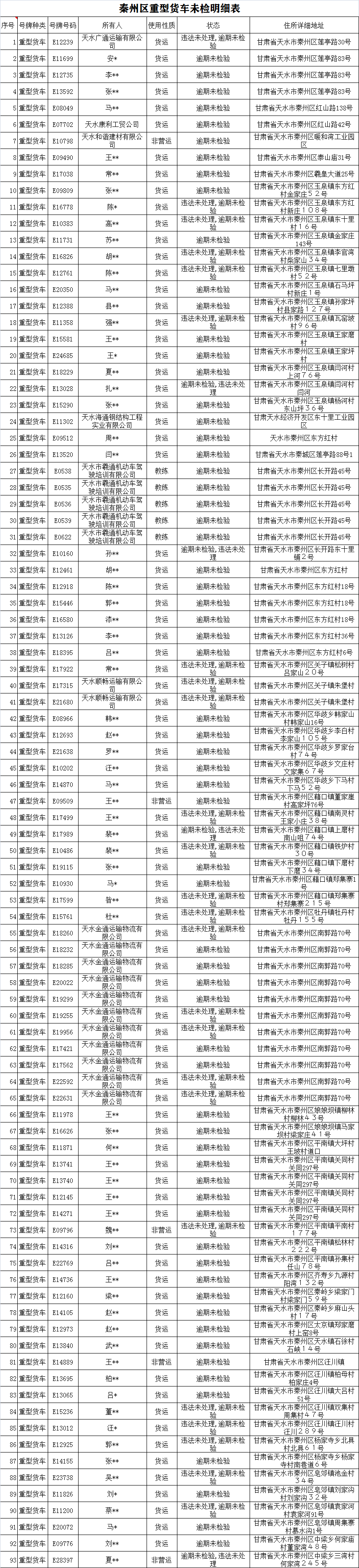 为持续推进道路事故预防“减量控大”工作,及时消除重点车辆安全隐患,预防和减少道路交通事故的发生,秦州公安分局郊区交警大队现将下列逾期未检验重型货车予以曝光,请车辆所有人及驾驶人尽快办理检验业务。