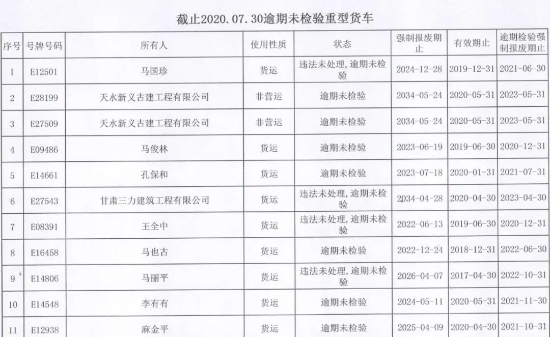现将以下重型货车车辆状态为逾期未检验的驾驶人进行公布,请车主尽快到公安交管部门办理年检手续,以免给您带来不便。