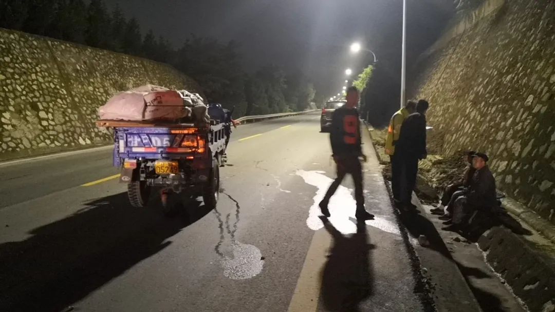 8月24日凌晨3时左右,卦台山大队民警接到110指挥中心指令称,在310国道原七里墩收费站附近发生一起交通事故,有人员受伤,且肇事车辆已驶离现场,要求出警。警情就是命令!民警在接到指令后火速赶到现场,发现现场只有一辆三轮汽车停在道路一侧,没有其他车辆踪影,两位老人神情慌张地坐在路旁。在询问完老人伤情之后,民警立即对现场进行了细致勘查。