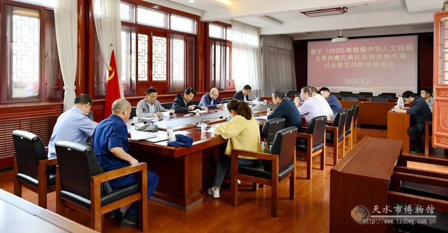 9月2日, 庚子(2020)年秋祭中华人文始祖太昊伏羲氏典礼活动总体方案社会稳定风险评估会议在天水市博物馆畅和轩召开,市文化和旅游局二级调研员张惠原主持会议,市博物馆副馆长管玉和有关部门负责人出席会议。