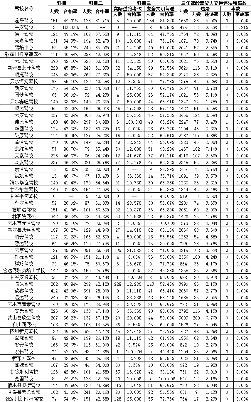 为切实加强道路交通安全源头管理,提升机动车驾驶人考试工作力度,强化培训和考试质量监督,根据《机动车驾驶证申领和使用规定》(公安部139号令)要求,天水市公安局交警支队对10月份全市辖区驾驶人培训机构考试合格率、三年驾龄驾驶人交通违法和事故情况排名公布如下: