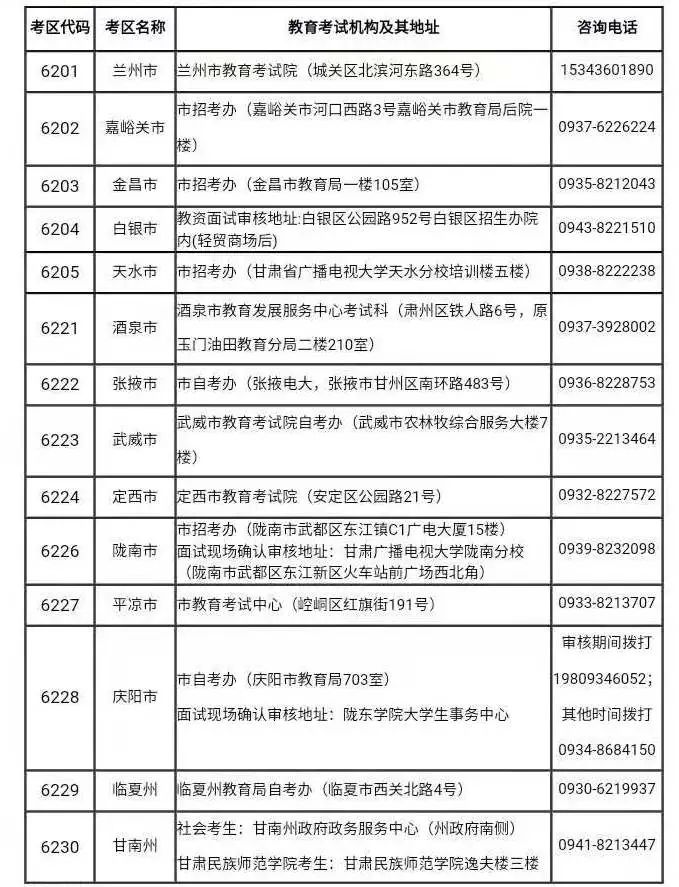 小学、初中、高中、中职学段中,心理健康教育学科类考生一律按兰州考区网上报名,到兰州市教育考试机构指定地点接受现场审核确认,并在兰州参加面试。凡小学、初中、高中、中职学段“心理健康教育”的考生网上填报到兰州以外考区的,相应考区不予审核通过。