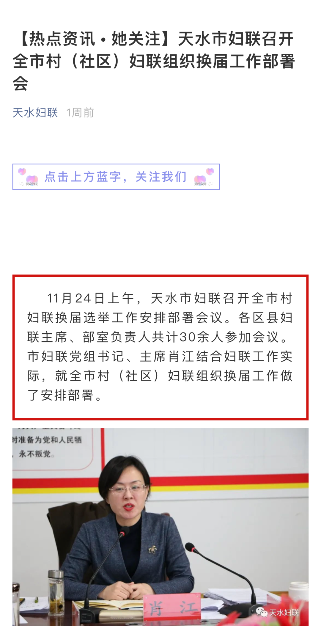 为继续深化妇联组织建设改革,坚持党建带妇建,认真做好村(社区)妇联与村(社区)组织同步换届选举工作,天水市妇联聚焦制度保障、业务培训,宣传部署、指导督促四个方面,不断提高思想认识、强化政治担当,以高站位、高标准、高质量抓实村(社区)妇联换届工作。