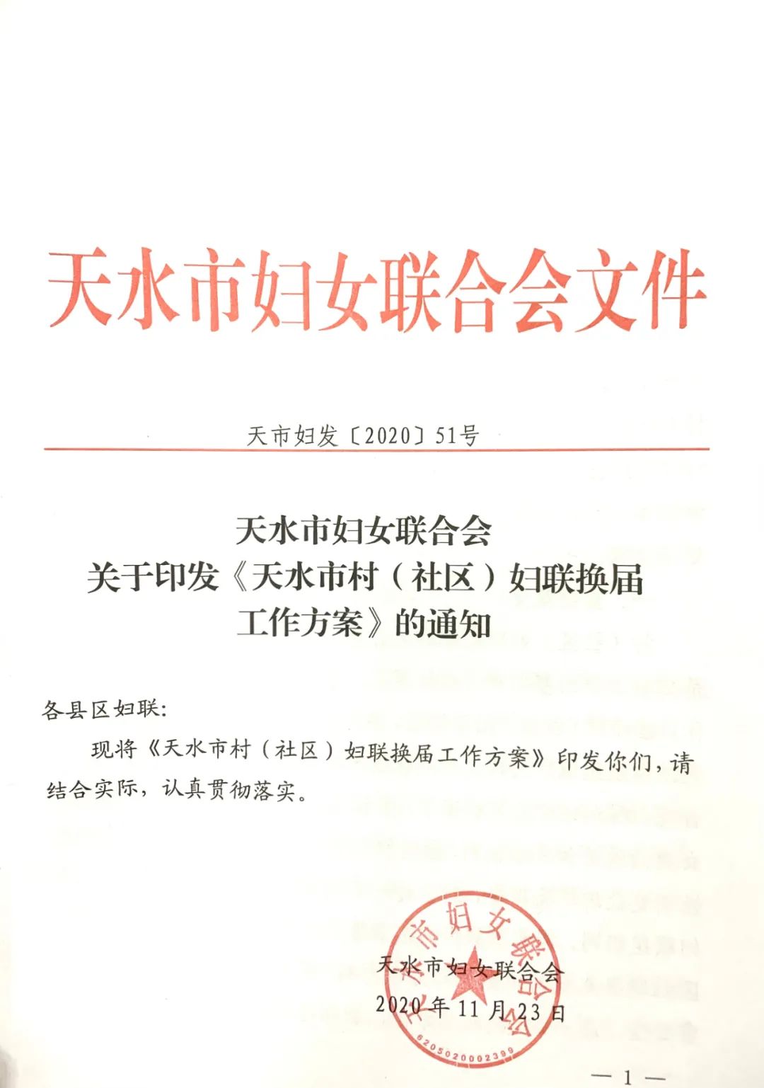 坚持提早着手,统筹谋划。天水市妇联坚持把党建带妇建作为推动村(社区)妇联换届的关键举措,积极争取市委市政府同意,市委办印发《坚持党建带妇建深化妇联组织改革推动妇女工作高质量发展的实施方案》,将妇联组织换届和村(社区)两委换届同步部署、同步推进。针对换届选举工作任务重、要求高,程序性强的特点,第一时间组织学习了省妇联关于印发《在全省村(社区)“两委”换届中推进女性参选参政和做好妇联换届工作的意见》的通知,印发《天水市村(社区)妇联换届工作方案》,做实做细换届各项准备工作,为稳步推进全市村(社区)“两委”换届工作打好基础。