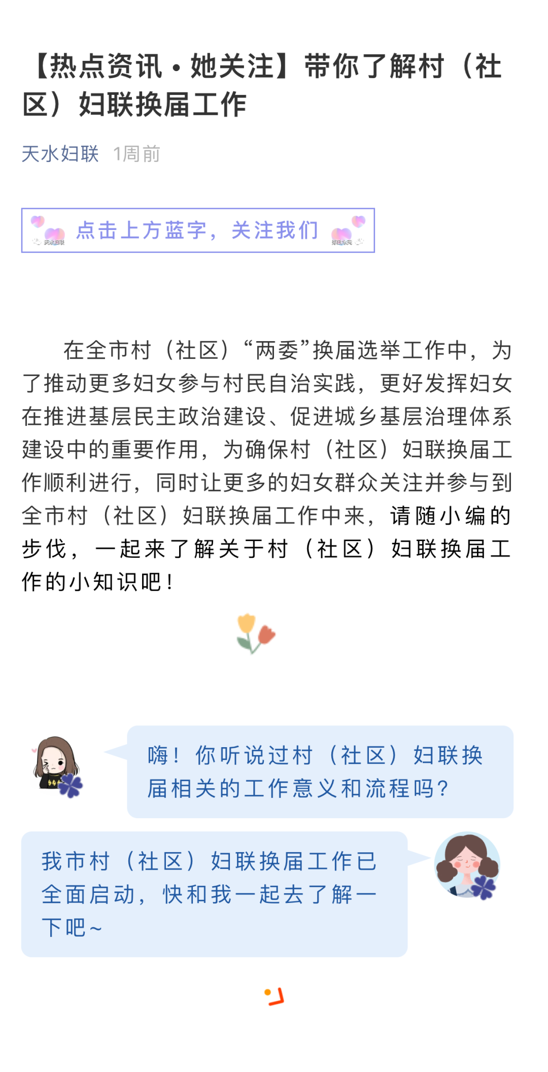市妇联充分利用网站、微信公众号等新闻媒体和设立宣传栏、印发宣传手册等形式,围绕村(社区)妇联换届程序步骤和纪律要求等进行大范围、多层次的宣传。下发《天水市村(社区)妇联换届工作指导手册》,制作换届图解漫画,各县区妇联充分利用大喇叭、微信村级姐妹连心群、抖音快手等群众喜闻乐见的形式,进行了深入广泛的宣传,全面动员各村(社区)妇联干部,提前谋划、摸清底数,切实将热爱妇女事业、综合素质良好妇女充实进妇联班子中,着力打造一支让党放心、让群众满意的基础妇联干部队伍。