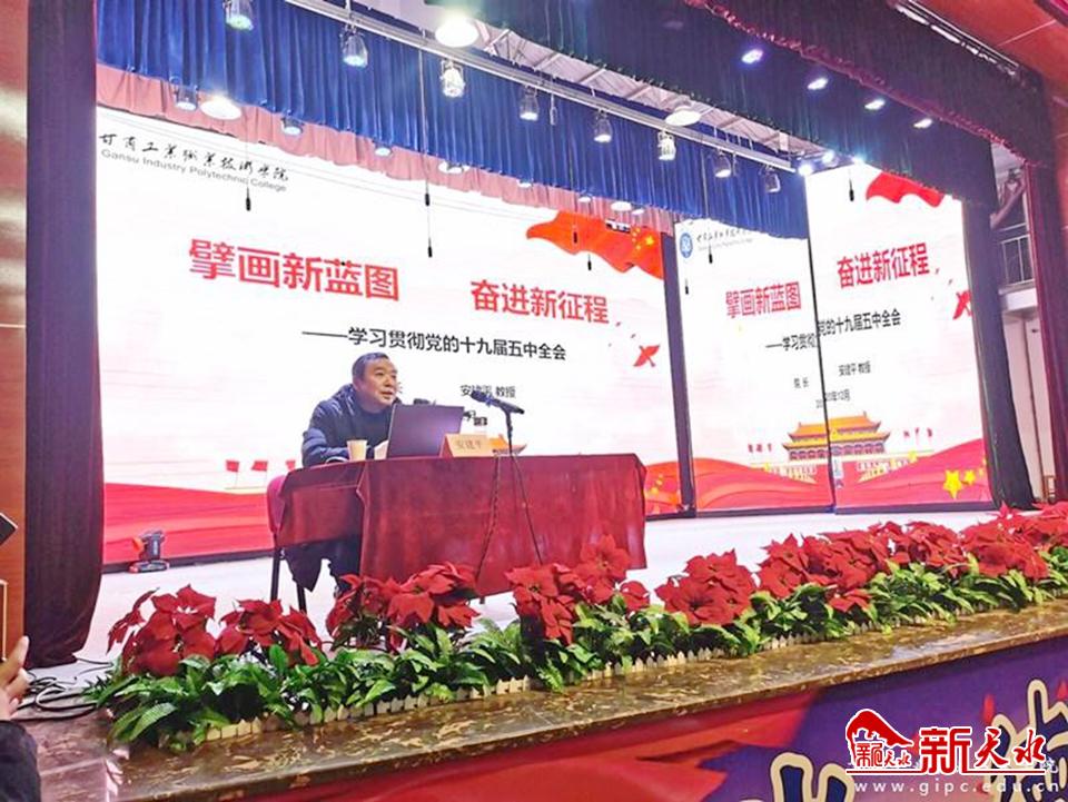 新天水讯 12月7日晚,甘肃工业职业技术学院党委副书记、院长安建平在大学生活动中心为建筑学院全体师生宣讲党的十九届五中全会精神。建筑学院全体教职工及19级、20级全体学生共计760余人聆听了报告。会议由建筑学院党支部书记、院长常青主持。