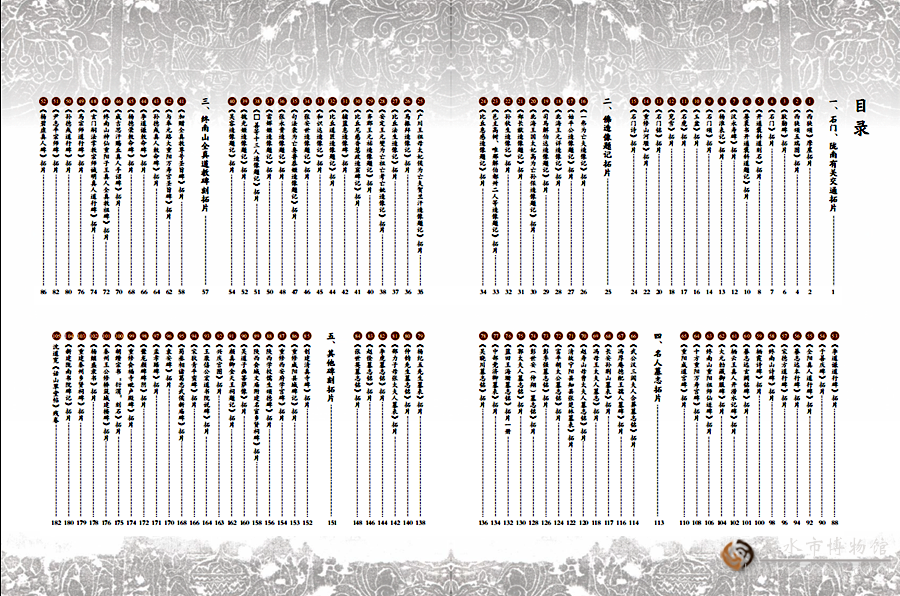 《镌拓千秋——天水市博物馆藏邵力子先生捐赠拓片精选》一书由天水市博物馆藏邵力子先生捐赠天水的拓片和少量天水市博物馆近年搜集的天水地区较有代表性拓片辑录而成,共计有拓片105件,每件拓片由拓片相关信息、拓片照片和释文三部分组成。全书所收录拓片分为五个类别,第一类为反映蜀道交通拓片,收录《西狭颂》《耿勋碑》和石门十三品等;第二类为佛教造像题记拓片,收录龙门二十品及天水地区一些造像碑拓;第三类为终南山全真道教碑刻拓片,内容涉及元代全真教人物得道成师、宫观建筑修建等;第四类为名人墓志拓片,收录陕西、天水及周边地区名人拓片;第五类为其他拓片,内容繁杂,既收录有《袁安碑》《孟孝琚碑》等,又有记载陕西、天水修建建筑和入祀名宦祠碑数通,也有历史、书法名碑如宋代狄青平蛮碑、颜真卿题记等。