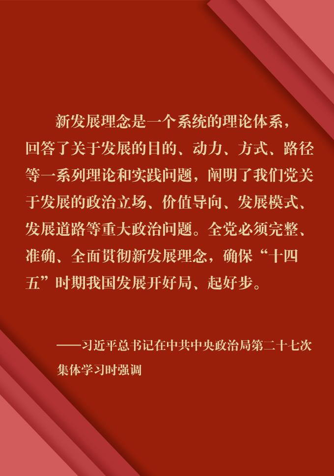 28日,中共中央政治局就做好“十四五”时期我国发展开好局、起好步的重点工作进行第二十七次集体学习。习近平总书记在主持学习时强调,新发展理念是一个系统的理论体系,回答了关于发展的目的、动力、方式、路径等一系列理论和实践问题,阐明了我们党关于发展的政治立场、价值导向、发展模式、发展道路等重大政治问题。全党必须完整、准确、全面贯彻新发展理念,确保“十四五”时期我国发展开好局、起好步。