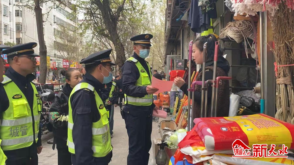 新天水讯 2021年4月8日下午,中城中队联合中城街道办等部门对新华西路严重店外经营商户发放专项整治通告和创建文明城市倡议书,为创建文明城市清零行动提前进入准备状态。