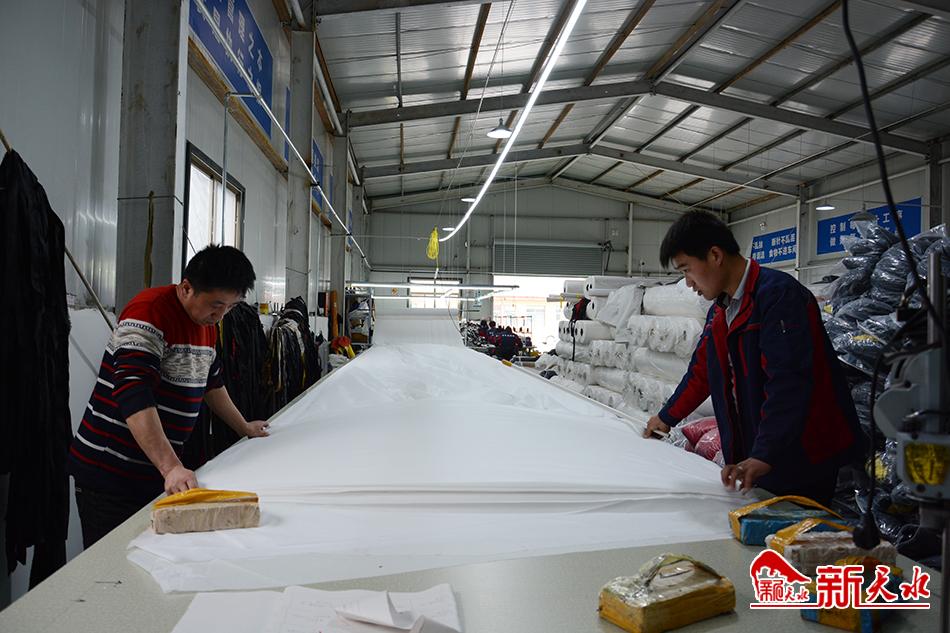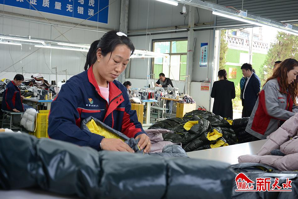5月21日,在位于清水县白驼镇梨湾村的甘肃华尔姿服装加工扶贫车间里,工人们正在忙着进行裁剪、充绒、包装……