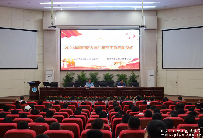 为全面落实国家、甘肃省关于做好大学生应征入伍工作相关精神,根据甘肃省委宣传部、甘肃省人民政府征兵办公室、甘肃省教育厅要求,甘肃工业职业技术学院于6月23日下午在图书馆智敏学术报告厅举行2021年秋季大学生入伍政策宣讲会。麦积区区委常委、区武装部部长李根来,党委委员、副院长、征兵工作站站长曹惠清出席活动,各学院征兵工作负责人、负责辅导员及学生代表等300人参加活动。