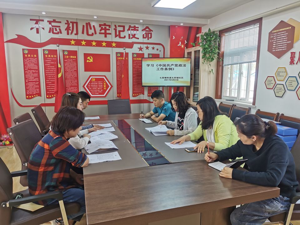 为了坚持和加强党对政法工作的绝对领导,做好新时代党的政法工作。牢固树立政治意识、大局意识、核心意识,坚决维护宪法法律权威,确保政法队伍全面正确履行中国特色社会主义事业建设者、捍卫者的使命。9月2日上午,七里墩街道五里铺社区在社区会议室组织社区干部学习《中国共产党政法工作条例》。