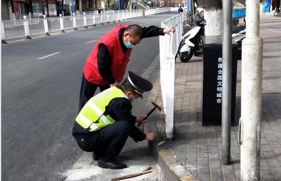 精心管理不停步:剩余261名执法队员全员上岗,克服困难,早出晚归,每天巡回在城区大街小巷,用脚步丈量,用绣花功夫管理,使静下来的城市更有整治、清洁、维护的空间力度,连日来,他们清理残缺破损的门头牌匾、春联、灯笼,清理市场周边堆积的杂物、垃圾,抓捕流浪犬,维修护栏道码、分道护栏,全力劝导疏散聚集、扎堆人群……