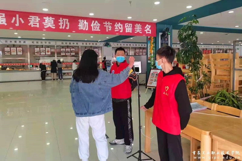 疫情防控工作常态化管理时,各食堂入口就设有一体化体温智能检测设备。在学校封闭管理期间,每天的就餐时段社团联合会志愿者就守在食堂入口体温检测设备处,时刻监测取餐师生的体温情况。食堂内,“同学你好,请出示你的取餐证”“请大家测温进入食堂,佩戴好口罩”“同学们,买饭也要注意安全距离”……每个窗口前都有社联防疫志愿者的身影,进一步保障了食堂就餐的有序进行,切实提高了疫情防控工作的科学性和有效性。
