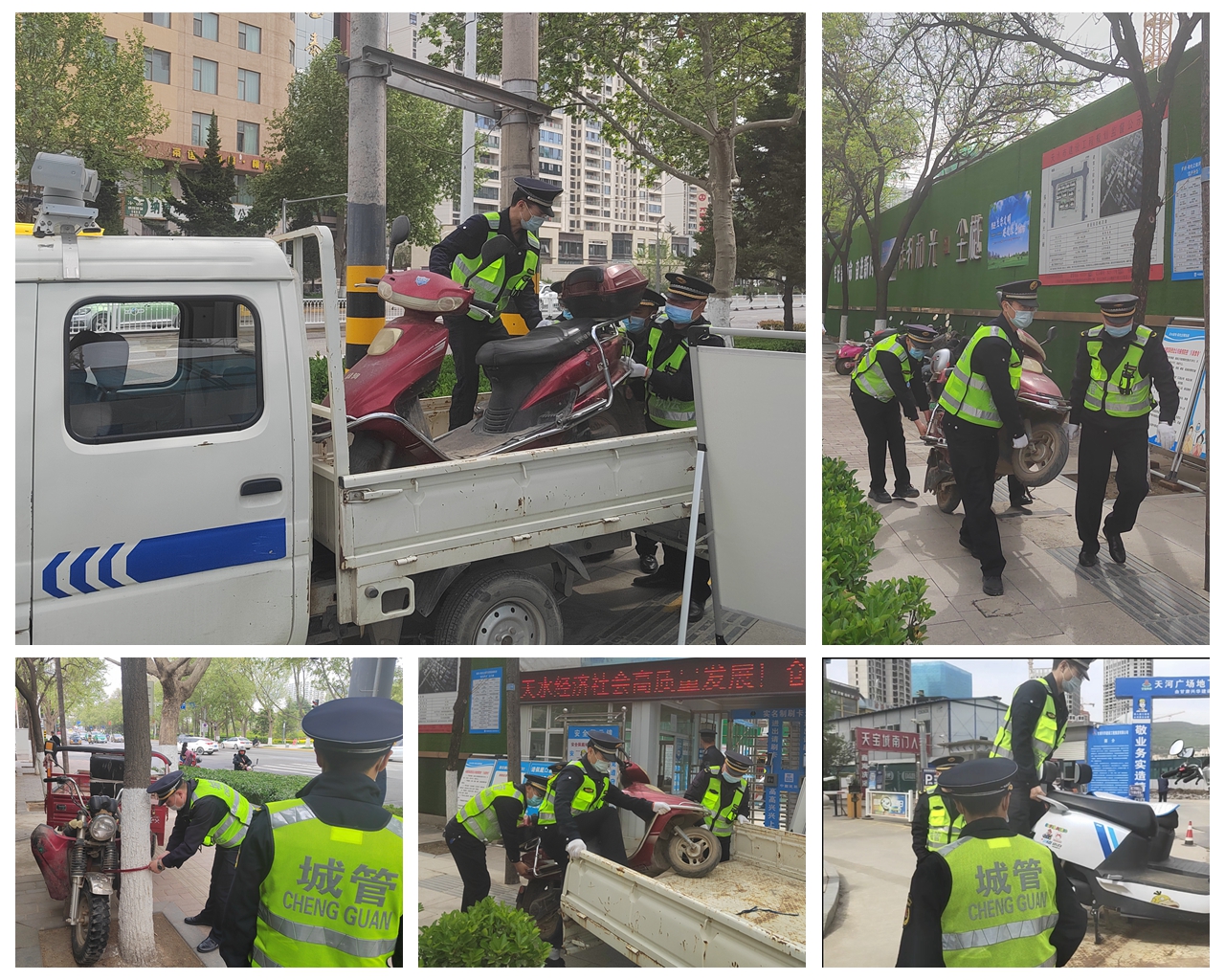从4月中旬起,各中队以文明城市创建工作为载体,全面排摸管理漏洞,细化工作措施,落实责任到人,集中整治城市“脏乱差”,维护交通秩序,推进蓝天保卫战,规范零工市场,清理占道报刊亭、电话、简易房,高标准打造整洁有序的城市环境。截至目前,共查处各类“八乱”行为320起,市容环境明显改善;疏导1200台次摩托车、电动车和自行车点内有序停放,依法暂扣26台,补装加装U型挡车桩和立柱31处63个,人行道通行秩序良好;及时制止“四烧”现象5起、噪音扰民12起、燃放烟花爆竹3起,开展建筑工地专项检查11次,查处未落实“6个100%”落实7家次,教育纠正夜间施工扰民行为6起,空气质量持续向好;劝导七里墩三角花园、双桥三中路口和天水郡高架桥下路边零工160人次进入秦州区零工市场,为广大零工和用工单位提供便利的同时,排除了交通安全隐患。清理各类报刊亭、电话亭、简易房5间,乱堆乱放杂物11处,实现了还路于民。
