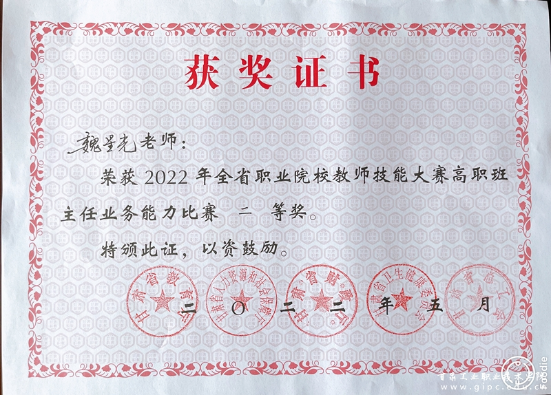 新天水讯 由甘肃省教育厅、甘肃省人力资源与社会保障厅、甘肃省财政厅、甘肃省卫生与健康委员会、省总工会联合举办的2022年甘肃省职业院校技能大赛班主任业务能力比赛圆满落下帷幕。甘肃工业职业技术学院喜获二等奖佳绩。