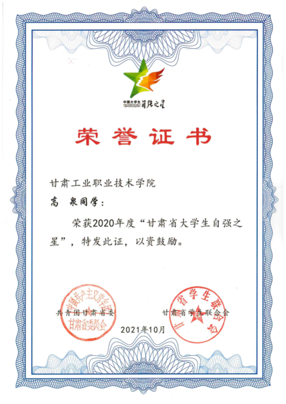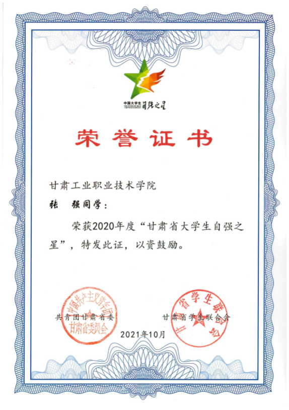 甘肃工业职业技术学院学子荣获2020年度“中国大学生自强之星”“甘肃省大学生自强之星”称号