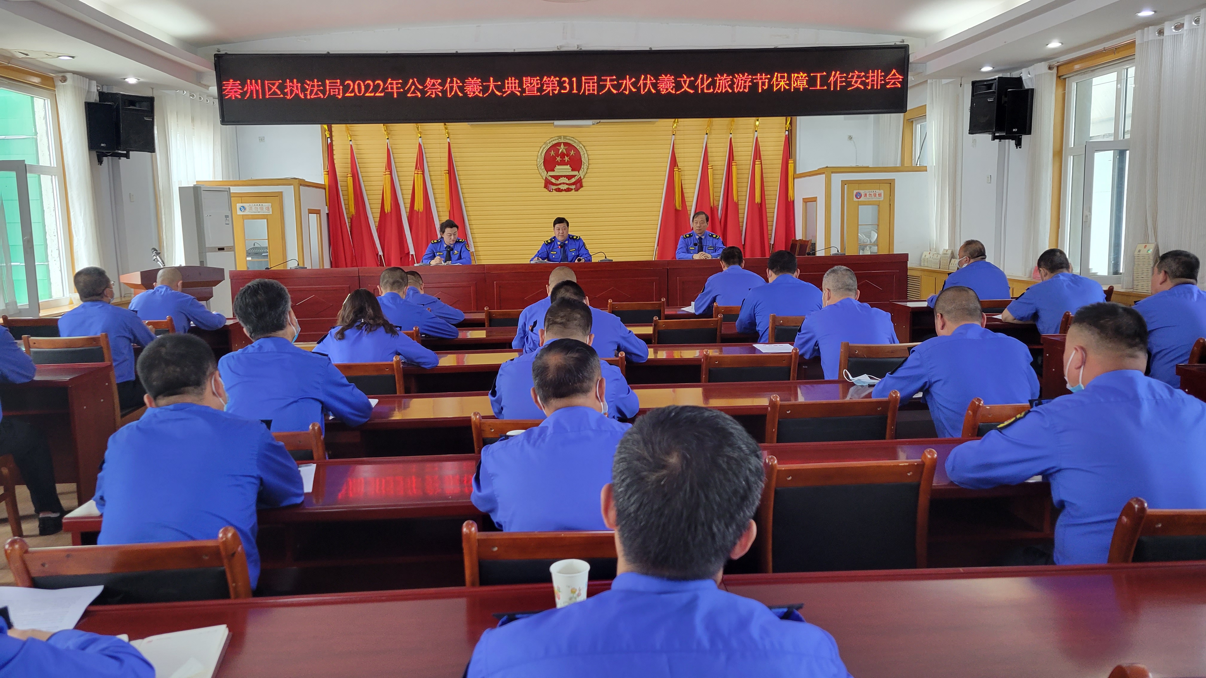 新天水讯 6月6日,秦州区执法局召开2022年公祭伏羲大典暨第31届天水伏羲文化旅游节保障工作安排会,吹响服务节会、保障节会的冲锋号,做详细安排、精心部署,统一思想,凝聚共识,强化措施,鼓劲加油,全力推动节会保障工作稳步有序开展,确保节会顺利圆满举办。