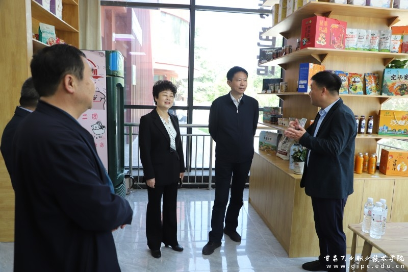 在新商科楼,调研组一行着重参观了经管学院陇货甘味天水特色馆,重点了解了天水的特色产品及具有悠久历史文化的文创产品。费志荣就学生实训、直播带货效益及校企合作问题与工作人员进行亲切交谈。