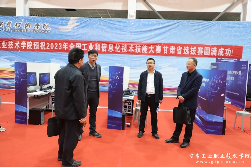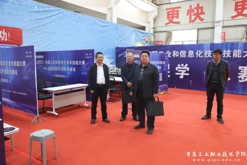 2023年10月27日,省工信厅电子信息与软件服务处处长魏万军一行4人莅临甘肃工业职业技术学院,实地检查了解学校承办的5G+虚拟现实开发应用赛项前期准备工作,副院长王利军及相关部门负责人陪同检查。