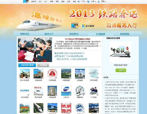 随着春运来临,中国铁路联手新华微博2013年铁路春运微平台将以更务实、高效和温馨的姿态助力春运平安、畅通,温暖广大旅客的回家之路。
