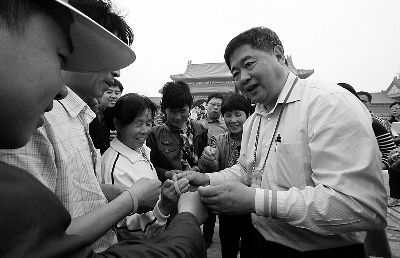 上午,故宫博物院院长单霁翔向观众发放带有“无烟故宫”宣传语的彩色手环,倡导文明参观 摄/记者 付丁