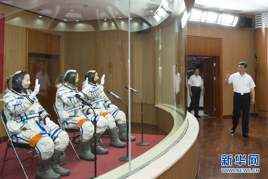 6月11日,中共中央总书记、中央军委主席、国家主席习近平来到酒泉卫星发射中心航天员公寓问天阁,为即将出征的航天员聂海胜、张晓光、王亚平壮行。新华社记者李学仁摄