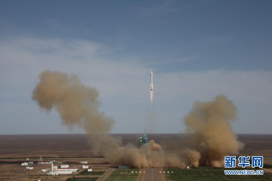 北京时间6月11日17时38分许,中国长征二号F运载火箭在酒泉卫星发射中心载人航天发射场点火起飞,将神舟十号载人飞船发射升空。中国航天员聂海胜、张晓光、王亚平搭乘神舟十号飞船出征太空。