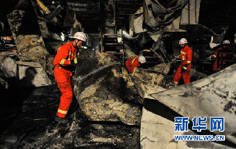6月3日,消防官兵在火灾现场进行搜救。当日,吉林省德惠市米沙子镇宝源丰禽业有限公司发生火灾。新华社记者 王昊飞 摄