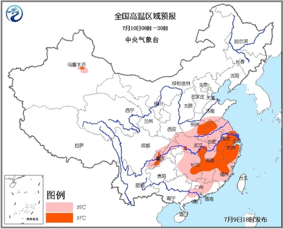 2. 中央气象台7月9日18时继续发布高温蓝色预警