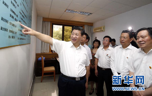 7月11日至12日,中共中央总书记、国家主席、中央军委主席习近平在河北省调研指导党的群众路线教育实践活动。这是习近平在正定县塔元庄村社区综合服务中心看望镇村干部和村民。新华社记者李涛摄