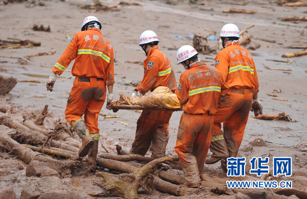 7月12日,消防队员在滑坡现场运送一具遇难者遗体。截至当日12时,四川省都江堰市中兴镇三溪村特大山体滑坡灾害现场又发现了4名遇难人员遗体。目前,都江堰市仍然继续组织公安、消防、特警、民兵队伍搜寻失踪和失去联系人员。新华社记者 薛玉斌 摄