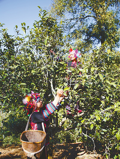 云南西双版纳勐海县布朗山的古茶园内,茶农正在采摘新茶。 许云华 摄