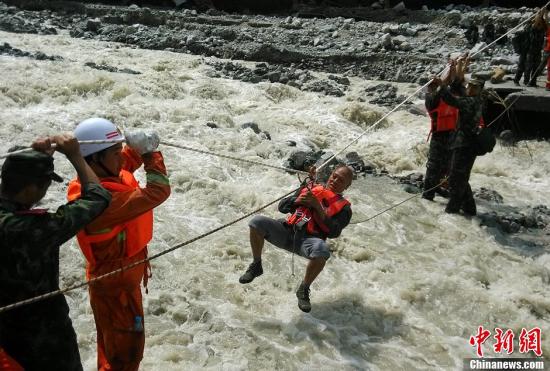 7月13日,四川消防官兵通过搭建绳桥的方式,将被困在国道213线映汶高速公路彻底关隧道附近的一名重伤员以及26名被困者成功转移。目前,受持续强降雨影响,阿坝州汶川境内发生的山洪泥石流、滑坡、塌方等灾害救援仍在持续中。图为消防官兵空中绳桥转移被困民众。中新社发 蒲建勇 摄