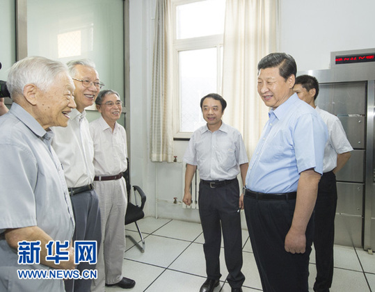 7月17日,中共中央总书记、国家主席、中央军委主席习近平到中国科学院考察工作。这是习近平同当年参与北京正负电子对撞机建设和应用的3位院士交谈。新华社记者 李学仁 摄